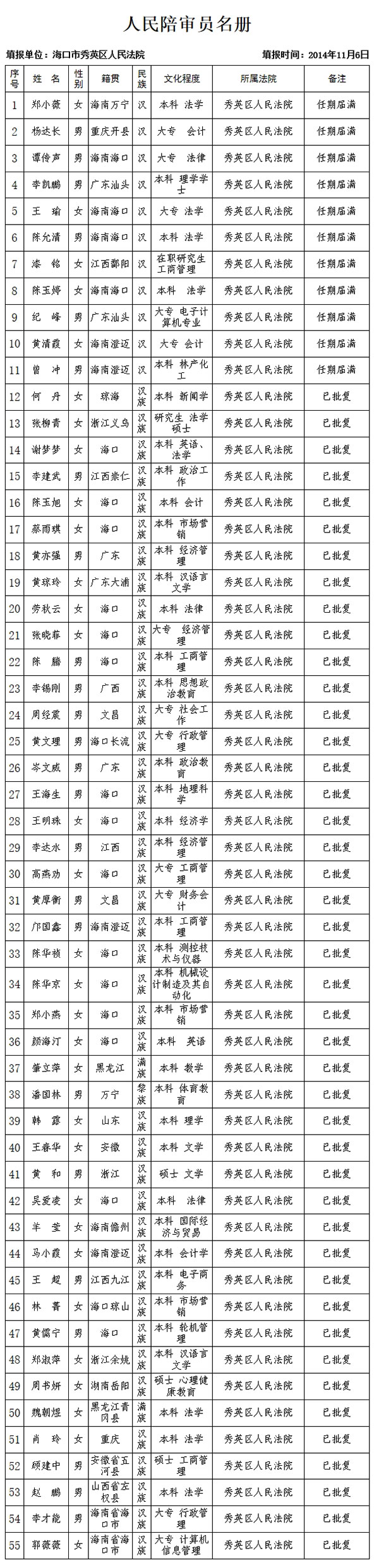 海口市美兰区人民法院人民陪审员名册