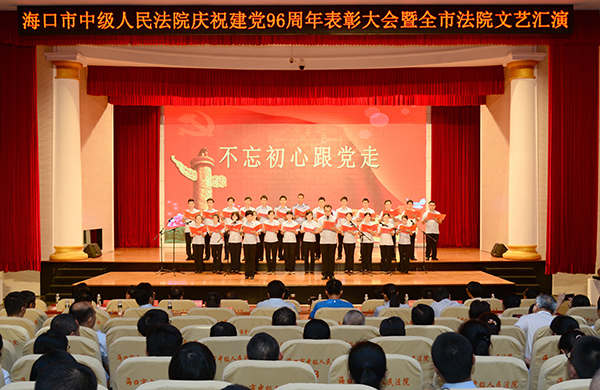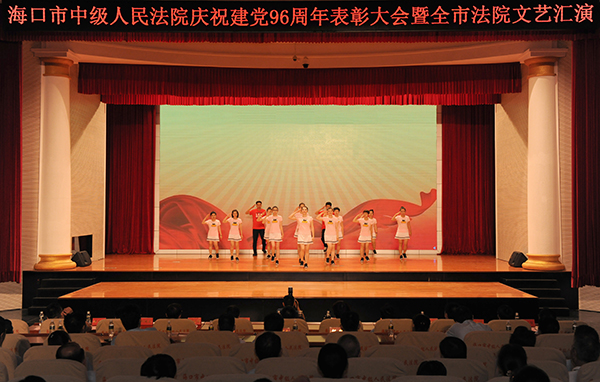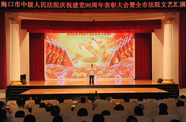 为隆重庆祝中国共产党诞辰96周年,表彰先进,弘扬正气,海口中院于6月30日下午举行庆祝建党96周年表彰大会暨全市法院文艺汇演活动。海口市直机关工委副书记杨林举等相关负责人到会指导。海口中院全体干警、离退休老干部以及辖区法院部分干警参加了会议。