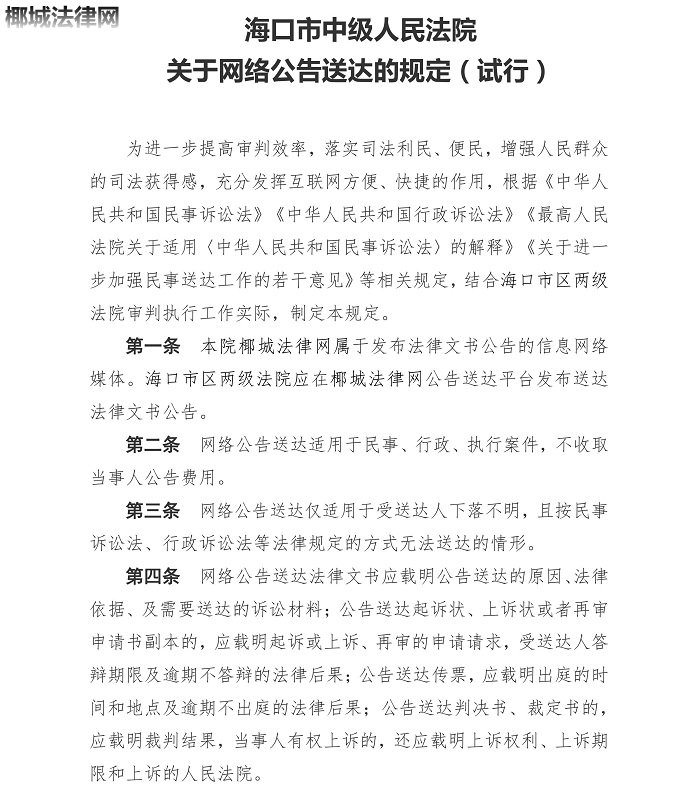 《海口市中级人民法院关于网络公告送达的规定 (试行)》
