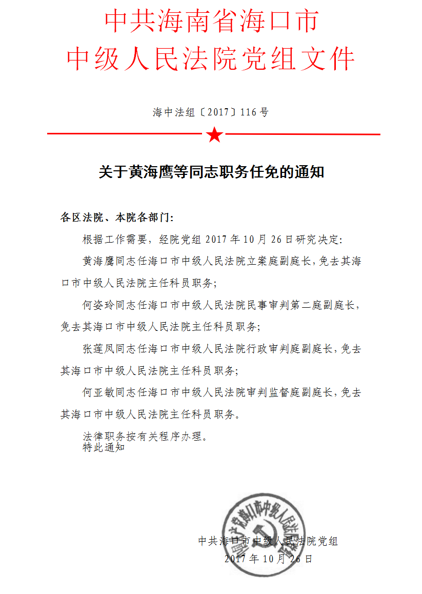关于黄海鹰等同志职务任免的通知