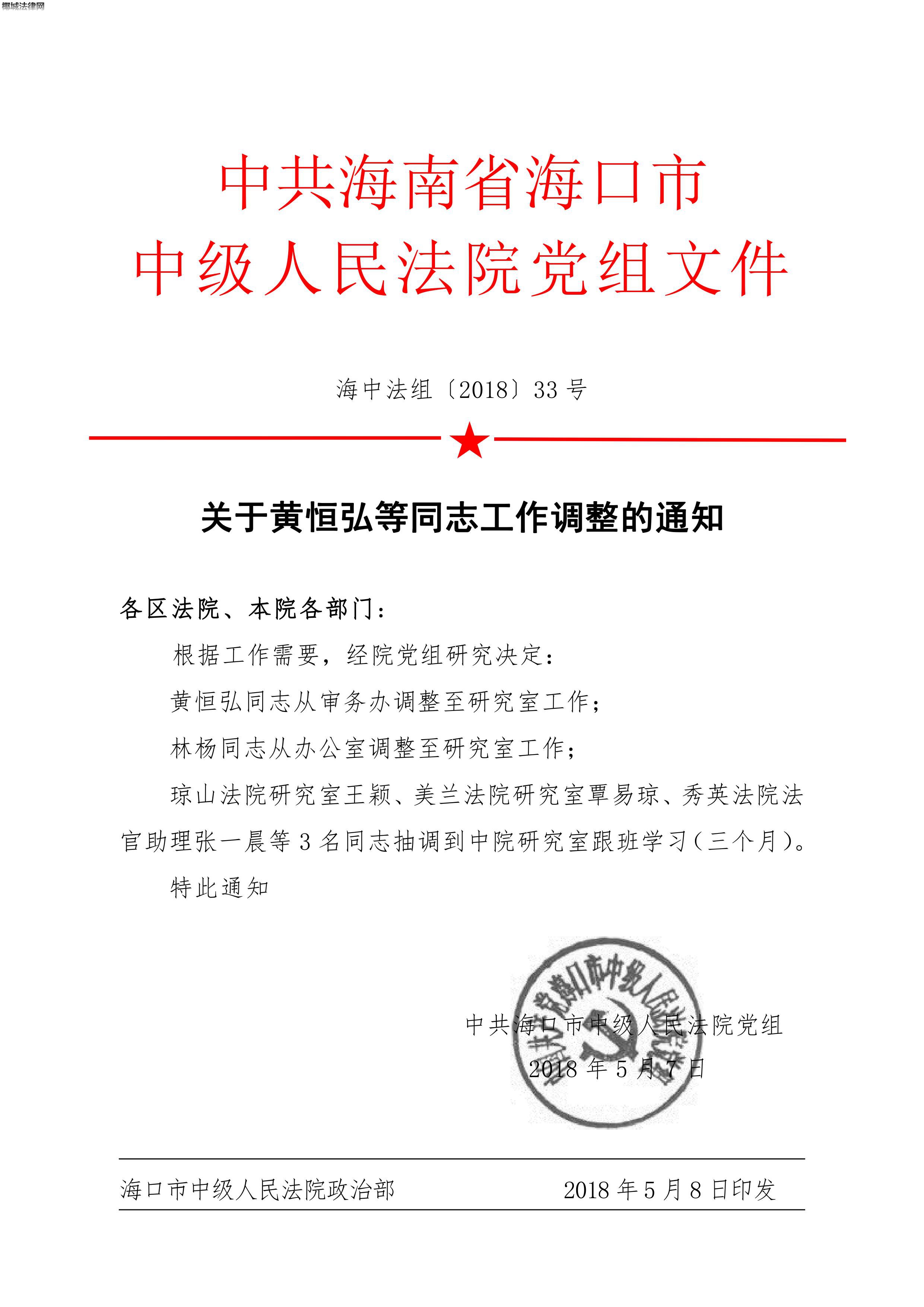 关于黄恒弘等同志工作调整的通知