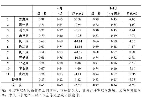 2018年1-4月海口中院各业务部门平均审理时间指数