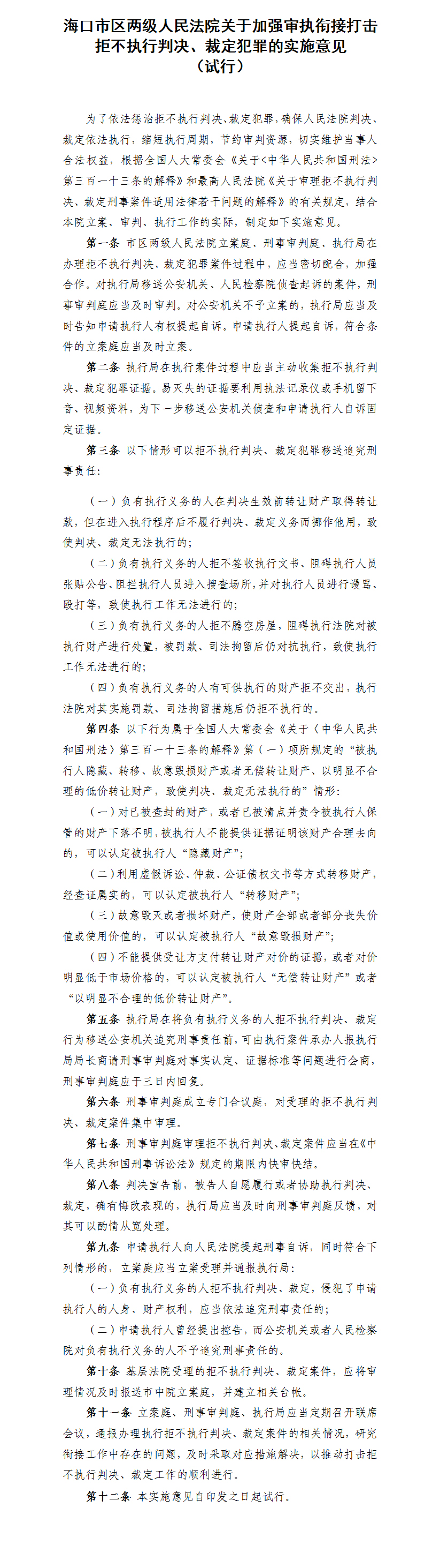 海口市区两级人民法院关于加强审执行衔接打击拒不执行判决、裁定犯罪的实施意见(试行)