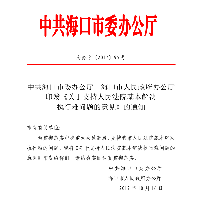 中公海口市委办公厅 海口市人民政府办公厅关于支持人民法院基本解决执行难问题的意见